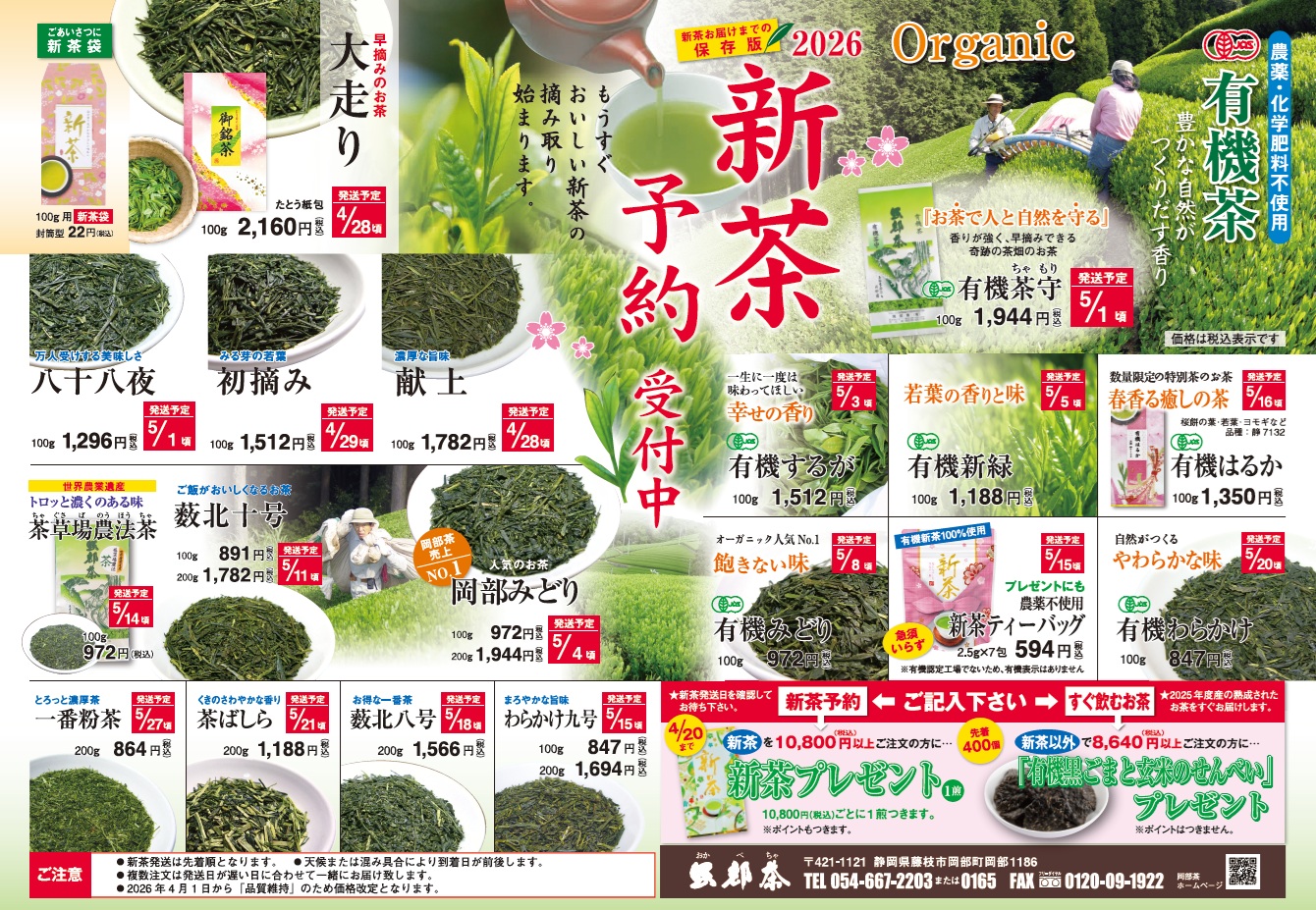 有機茶や深蒸し茶の確かな味わいに加え、昔ながらの無添加の自然食品まで、安心して毎日楽しめる品々をご用意しております